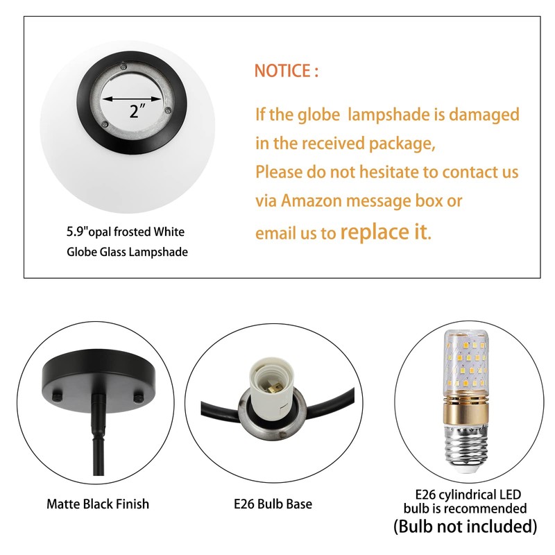 - 【Perfect Size & Specific Bulb Required】Mid Century spheres Hanging Lighting size: 16.93'' L x 4.72'' W x 5.59'' H. Canopy diameter 4.72” Shade diameter 5.9”. The black ceiling light is E26 Base(60W Max ),E26 cylindrical LED bulb is recommended.(NOTE: bulbs NOT included. Bulb diameter must not exceed 1.9 inches.).It is fully dimmable when used with a dimmer bulb and compatible dimmer switches(not included) to adjust the lighting effect to your needs.