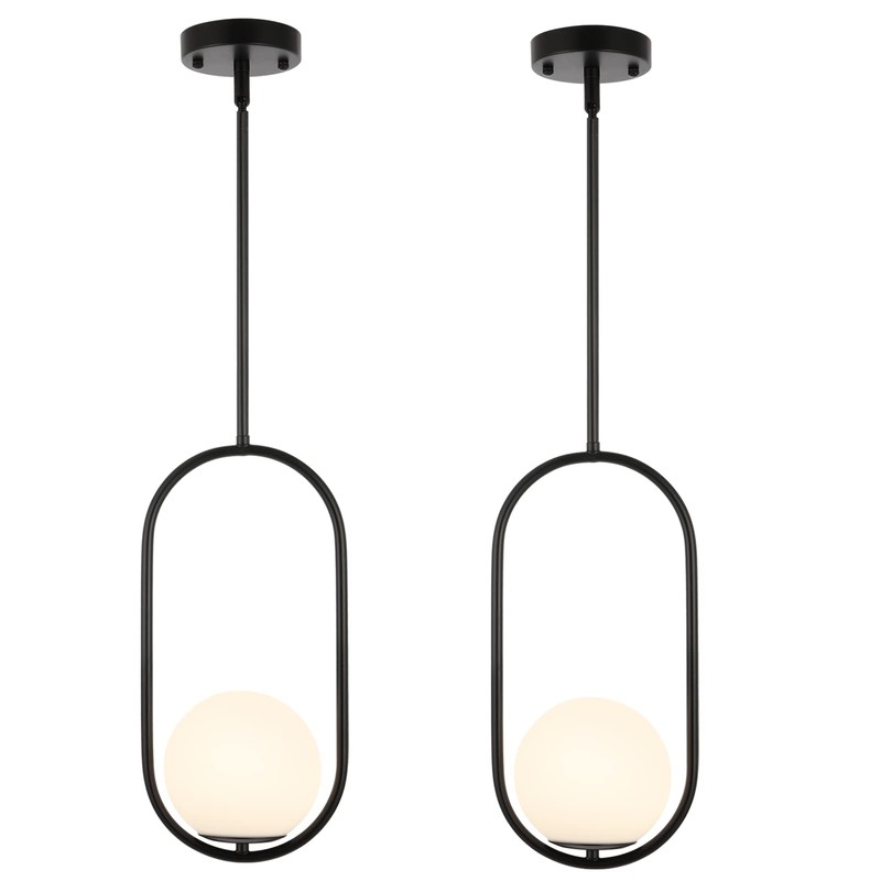 BYOLIIMA Modern Globe Pendant Light Mid Century Chandelier 1-Light Matte Black Ceiling Hanging Lighting Fixture with White Globe Glass Lampshade for Kitchen Island Dining Room Bedroom (2 Pack)