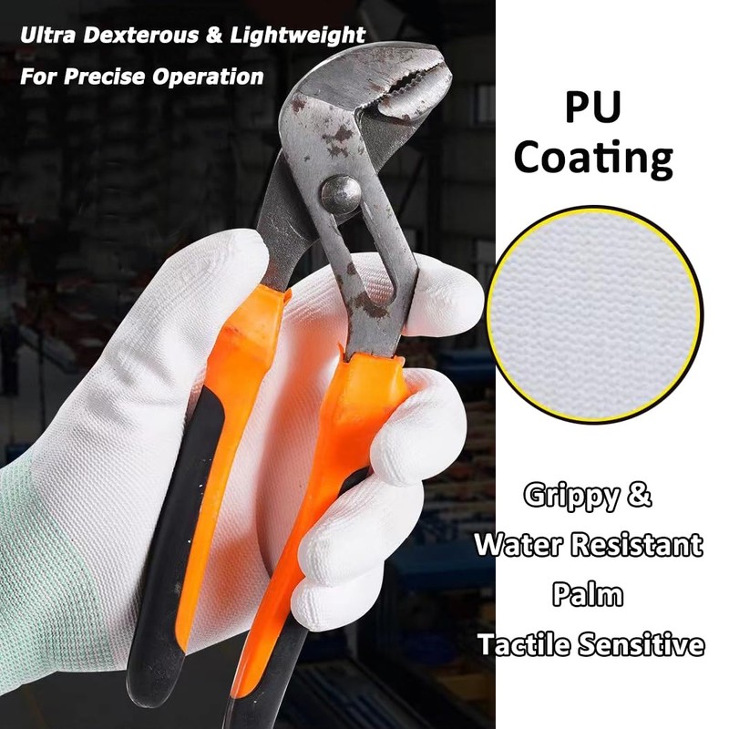 • HIGH-GRIP COATING FOR SECURE HANDLING – Each glove features a polyurethane-coated palm and fingertips, providing enhanced grip and abrasion resistance. This design helps improve control when working with tools, handling parts, or managing oily or wet surfaces during light to medium-duty tasks.