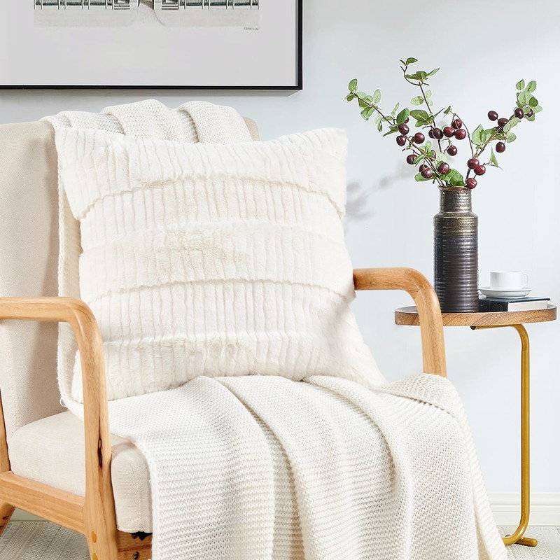 BYTIDE Embossed Stripe Luxury Faux Fur Decorative Throw Pillow Cover with Velvet Back 20 x 20 Inches, Plush Square Soft Cushion Case Pillowcase for Couch Bed Bedroom Living Room, White