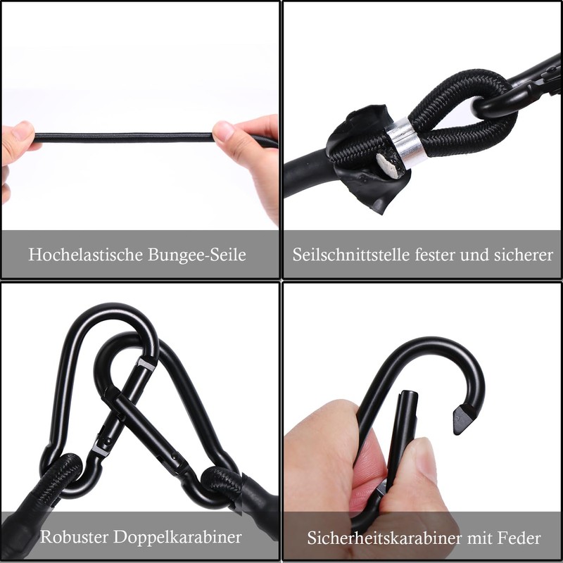 - Elastic band, black, assorted size: 4 pack bungee cord hooks 30 cm. It has an advantage in length and width over ordinary bungee cords. It has a stronger load capacity and can meet your higher requirements. These high-performance bungee cords are highly elastic and supportive and are compatible with bags of all sizes and weights. Compatible with all bikes, cars, carts, pannier racks, camping, gardening, washing lines