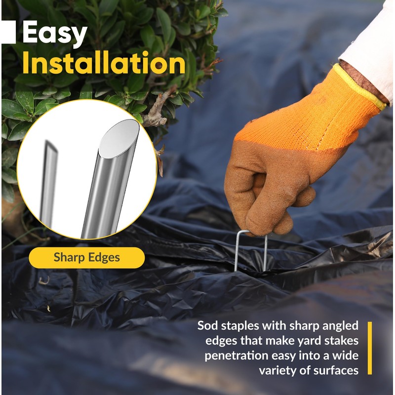 - Easy to use - Easy to use sod staples with sharp angled edges that makes yard stakes penetration easy into a wide variety of surfaces including soil, landscape fabric, gardens, and wood holes