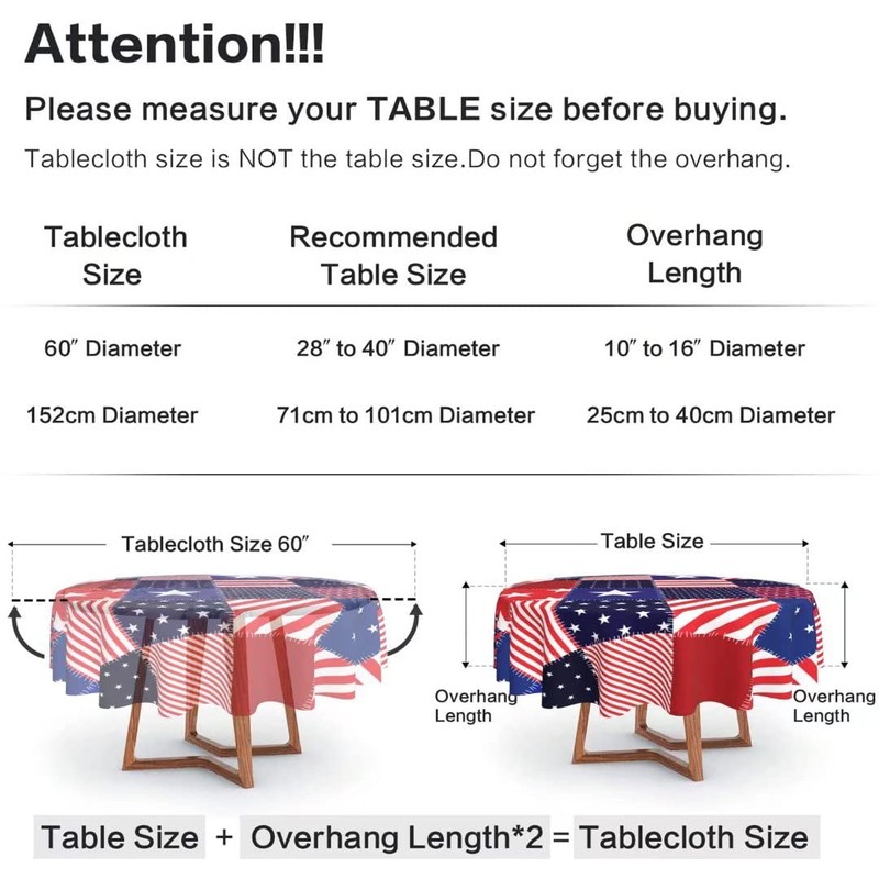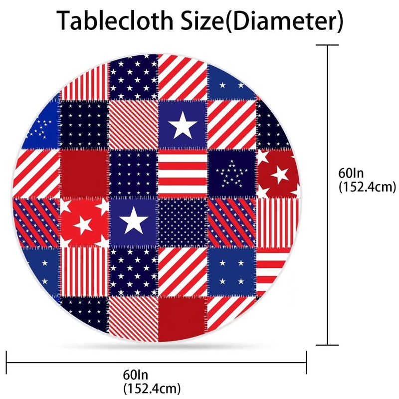 - Memorial Day tablecloth Size: 60 inches in diameter. Suitable for round tables 28"- 40" in diameter.