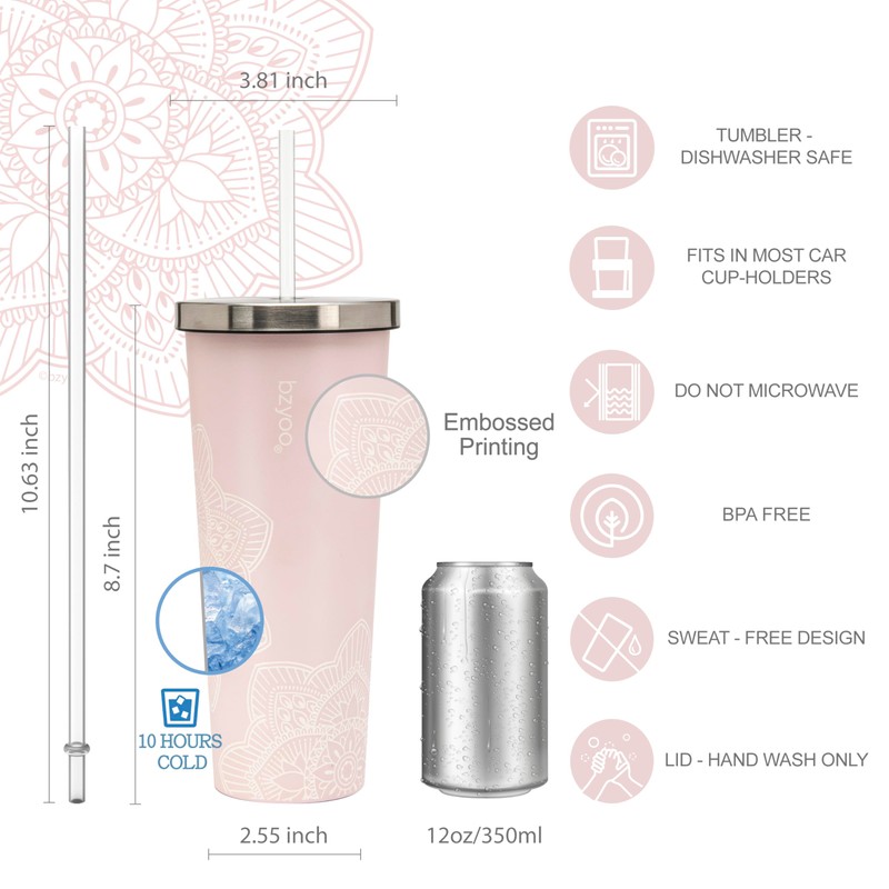 - 𝗦𝗧𝗬𝗟𝗜𝗦𝗛 𝗗𝗘𝗦𝗜𝗚𝗡𝗦: Introducing bzyoo 24oz double walled Stainless-Steel straw tumbler with removable lid. This tumbler has unique design with powder coated finish based with embossed printing design printing on top, not only it looks beautiful it also gives you more solid grip when holding your beverage. You can feel the amazing design embossed printing on the tumbler that will make it stand out. Great for all kind of occasions.
