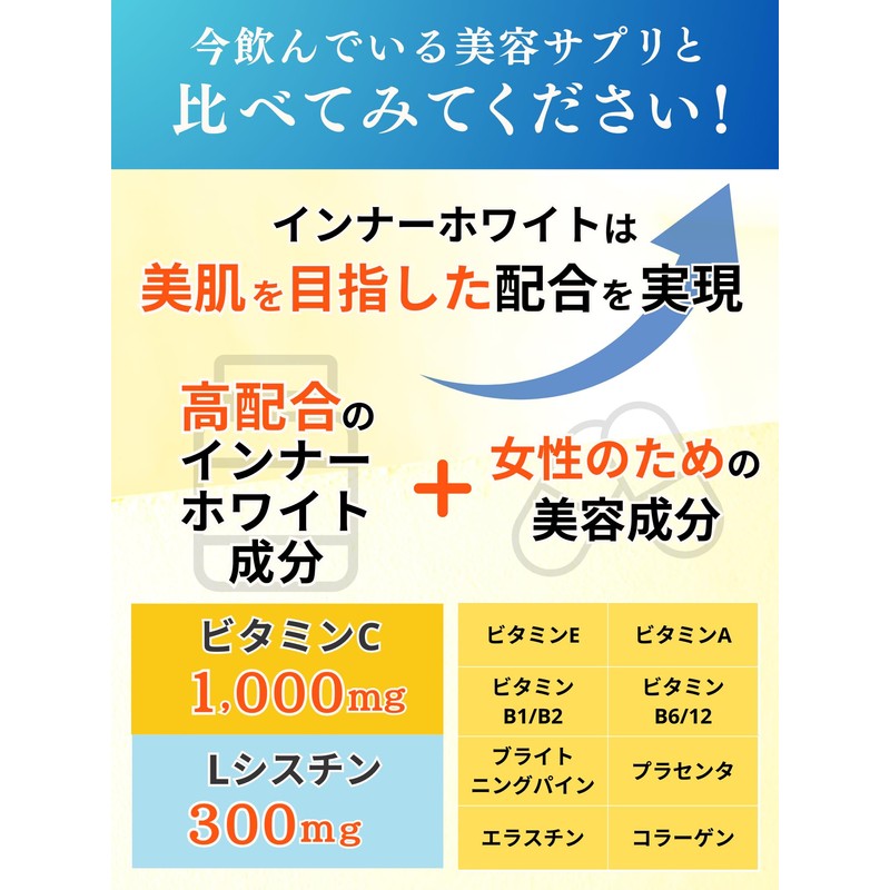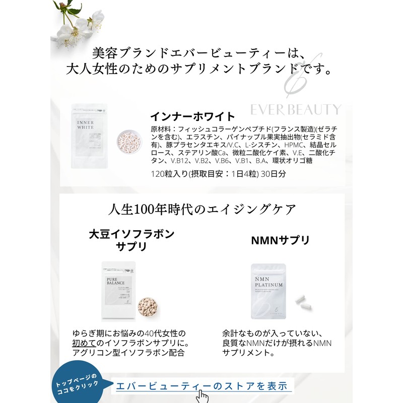 - 【一世紀美人を目指そう!】女性の美しさをサポートするエバービューティーが開発した、こだわりの美容成分を贅沢に配合した美容サプリメント、INNER WHITE(イナー ホワイト)。ビタミンC、Lシスチン、コラーゲン、プラセンタ、ブライントニングパイン、エラスチンなど、太陽に負けない、女性を内側からキレイにする美容成分たっぷりの、究極のオールインワン美容サプリメントです。