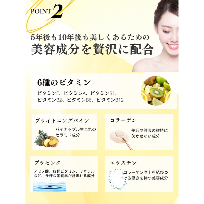 - 【こんなサプリ見たことない!】2大成分ビタミンCとLシスチンにプラスして、内側から美しさを導く美容成分をたっぷり配合。コラーゲン、プラセンタ、ブライントニングパイン、エラスチン、さらにビタミンA、ビタミンB2、ビタミンB6、ビタミンB12、ビタミンEなど、美のためにこだわり、厳選した成分が贅沢に配合された、究極のホワイトケア美容サプリです。