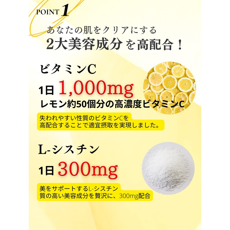 - 【太陽対策に!2大成分を高配合】ビタミンCは1日1000mg(レモン50個分の高濃度ビタミンC)。 ビタミンCを1日1000mgすることで、失われやすいビタミンCを適宜摂取できます。女性のための美容成分Lシスチンは、1日なんと300mg!