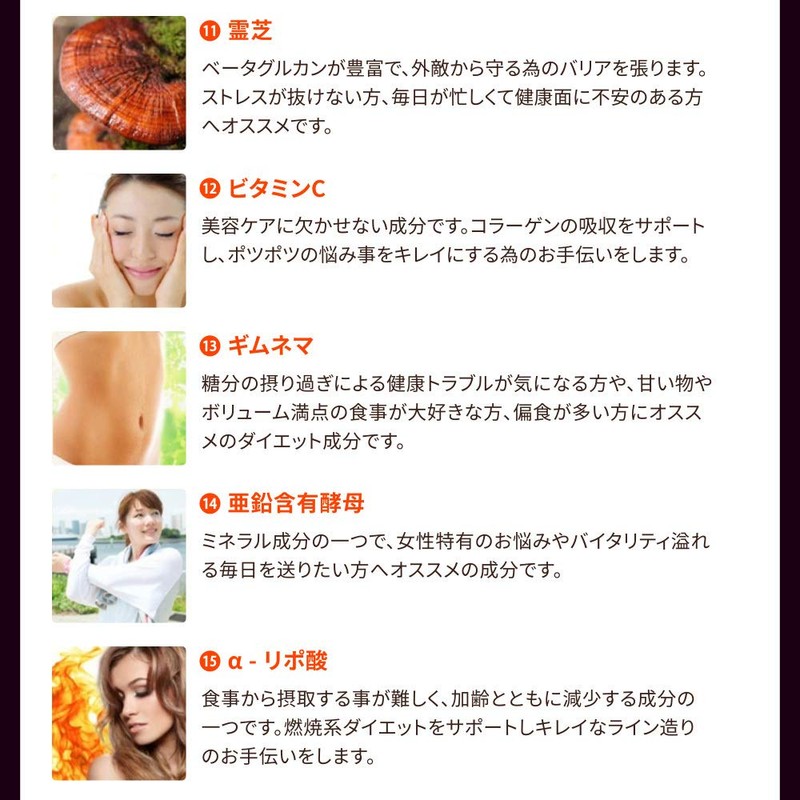 - シークワサーエキス、マカ、田七人参、グァバ、ゴーヤー、秋ウコン、春ウコン、 ガジュツ、コラーゲン、グルコサミン、ドロマイト、イチョウ葉エキス、牡蠣肉エキス、 ビタミンC、霊芝、ギムネマエキス、α-リポ酸、ビタミンB1、ビタミンE、亜鉛酵母
