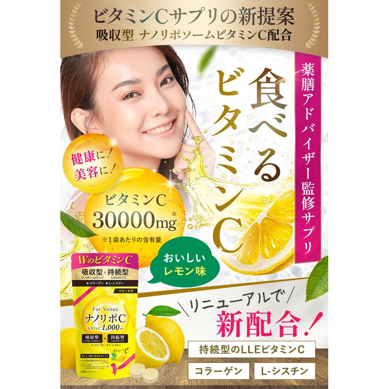 • ◆吸収型×持続型。吸収して、続く。WのビタミンC。 WのビタミンCを毎日、ラムネ感覚でとることができます。 1日分(4粒)で ビタミンC1000mg 約レモン67個分! ForVenusナノリポCは、「しっかり吸収」と「長く持続」にこだわったビタミンCサプリメントです。 最新技術による ナノリポソーム型ビタミンC と、体内でゆっくり働く LLE型ビタミンC をダブルで配合。さらに、コラーゲン と L-シスチン をプラスして、美容と健康をトータルでサポートします。 国内 自社工場 製造。占部大観堂製薬(株)が開発製造したサプリメントです。