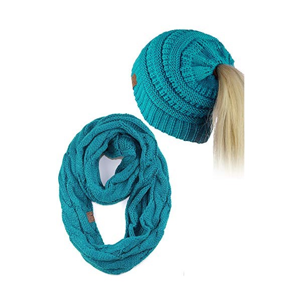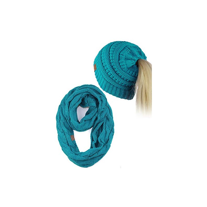 C.C BeanieTail Messy High Bun Cable Knit Beanie and Infinity Loop Scarf Set, Teal