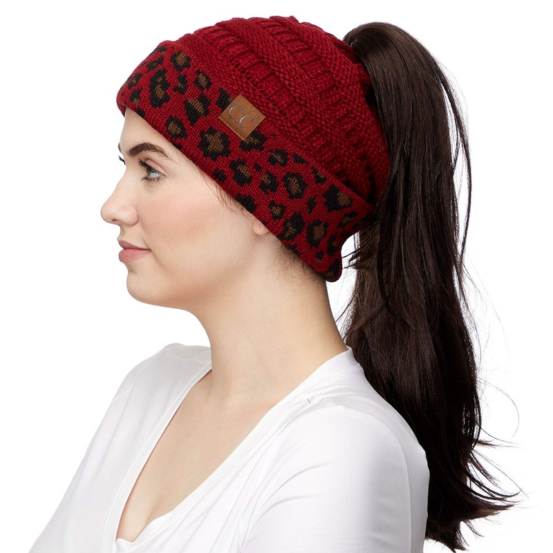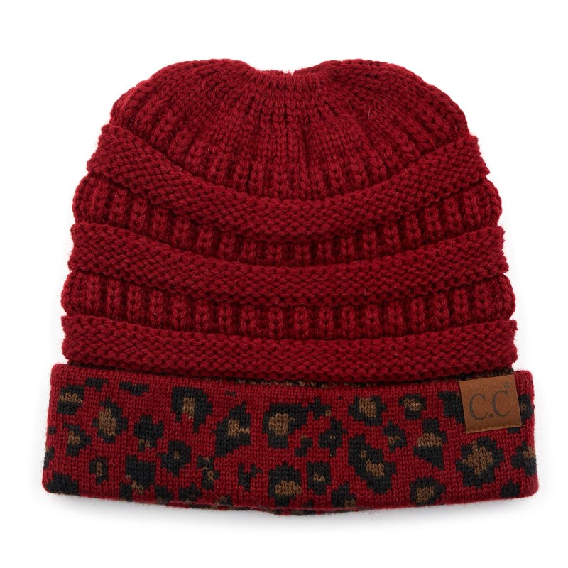 C.C Exclusives Solid Color Ribbed Beanie Ponytail hat with Leopard Pattern Cuff (MB-80) (Burgundy)