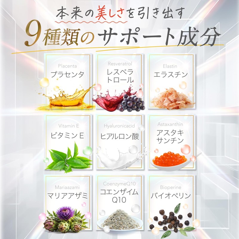 - 【9種類の美容成分】ビタミンCだけでなく、プラセンタやヒアルロン酸、今注目のアスタキサンチンなど9種類の美容成分を配合しました。