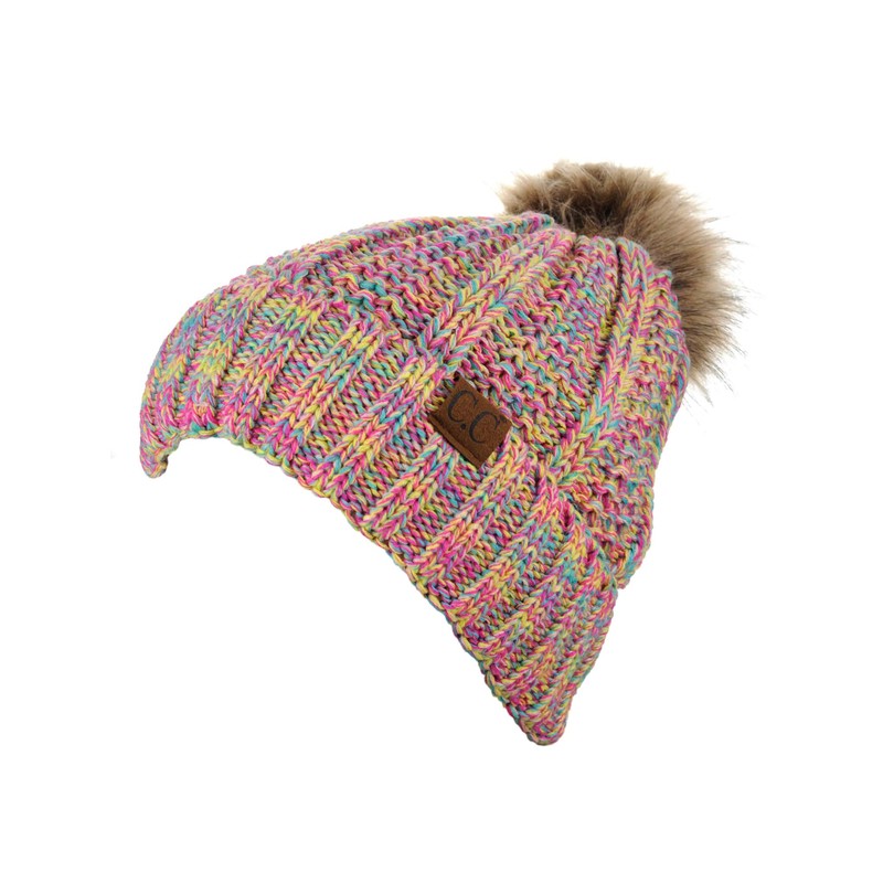 C.C Thick Cable Knit Faux Fuzzy Fur Pom Fleece Lined Skull Cap Cuff Beanie, Bright Mix
