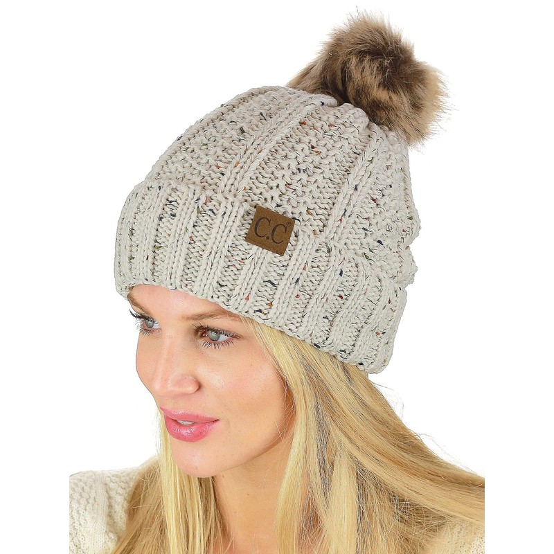 C.C Thick Cable Knit Faux Fuzzy Fur Pom Fleece Lined Skull Cap Cuff Beanie, Confetti Oatmeal