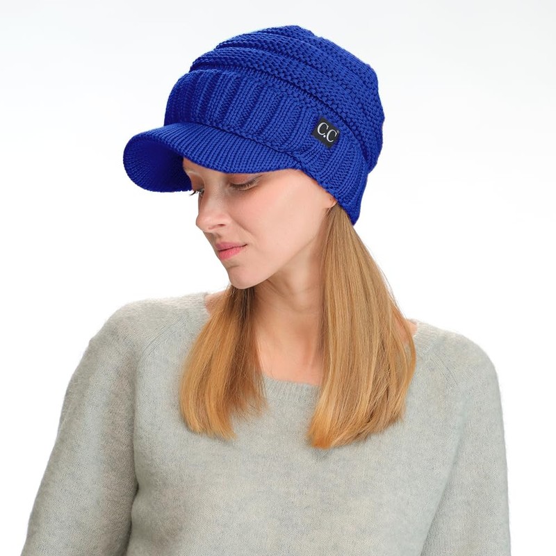 C.C Trendy - Gorro de punto holgado de gran tamaño, grueso, suave, acanalado, con visera, Azul Real, Talla única