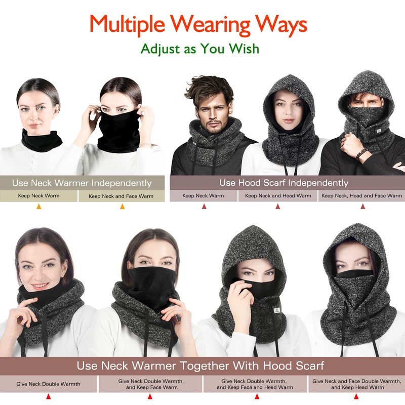 - ❤️[Multiple wearing ways - Adjust as You Wish]: The body heats after walking or cycling for a while. balaclava Hood Scarf and Neck Warmer is easy to adjust the wearing way quickly (see the wearing figure) to the best comfortable feeling,avoids stuffiness during exercise, and keeps comfortable body temperature.For example, exposing the nose, or nose and mouth, can breathe smoothly. The balaclava Hood Scarf comes in 3 fashionable colors match with your coats well.