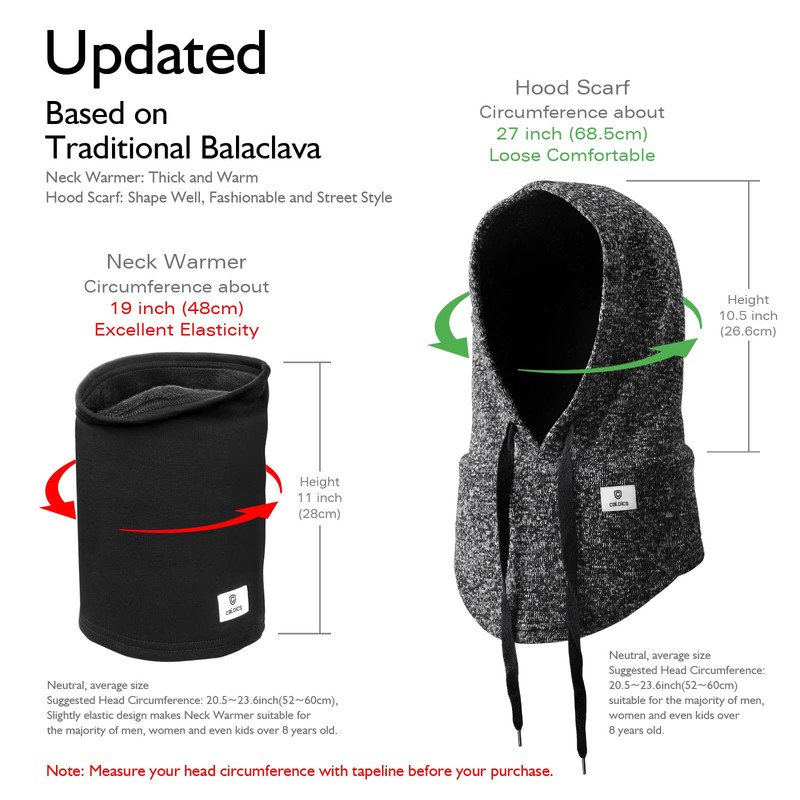 - ❤️[Quick to Wear]: Put on balaclava Hood Scarf within 1 second. Convenient to take your children to school, pick up kids, go out shopping, fetch express deliveries, commute, skiing, long and short distance hiking, and ride a bicycle in the cold winter. Universal for men and women, suitable for children over 8 years old. (Measure your head circumference with tapeline before your purchase.)