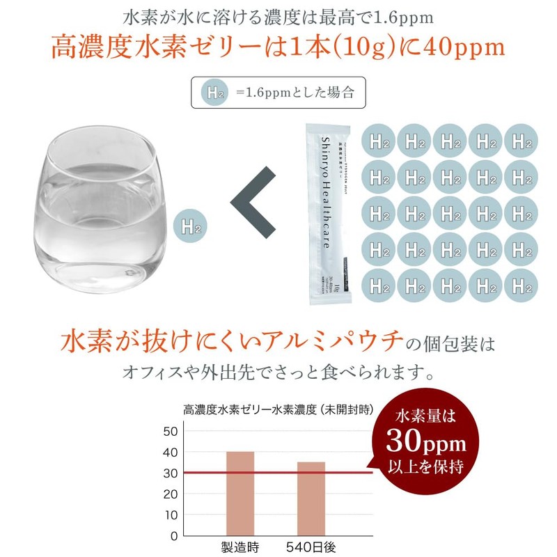 - 【おすすめ理由1】 特許取得技術でゼリーに閉じ込めた、たっぷりの水素。水素濃度はなんと水素水の約100倍!高濃度水素を毎日の生活に、手軽に、美味しく、取り入れられる商品は「高濃度水素ゼリー」だけのもの。たっぷりの水素の気泡を含んだシュワシュワ食感のゼリーで、圧倒的水素感をご体感ください。※市販水素水の水素濃度が0.4ppm、高濃度水素ゼリーの水素濃度が40ppmの場合