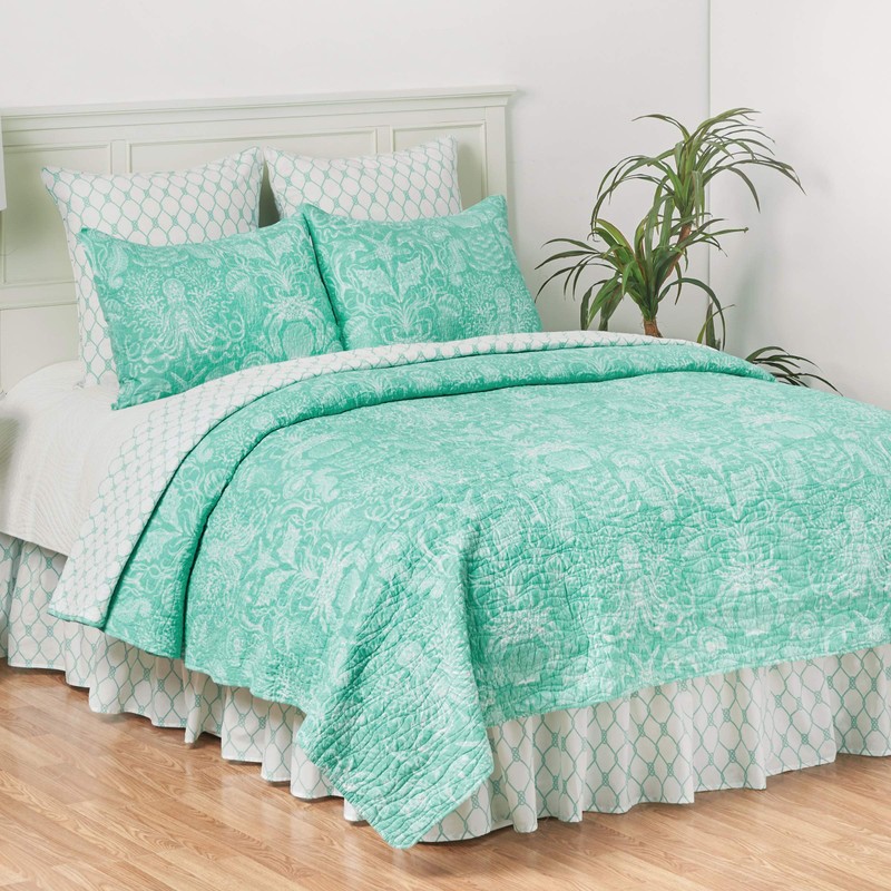 - UNIQUE DESIGN: Bring the ocean to you - no matter where you are - with Turquoise Bay. Featuring a graceful marine pattern on vibrant seafoam green, the Turquoise Bay quilt set is perfect for a modern beach look, a sophisticated coastal bedroom, or a relaxing vacation spot. Turquoise Bay is quilted with undulating wave stitching and reverses to a net and double Carrick bend knot design for even more coastal and nautical styling options.