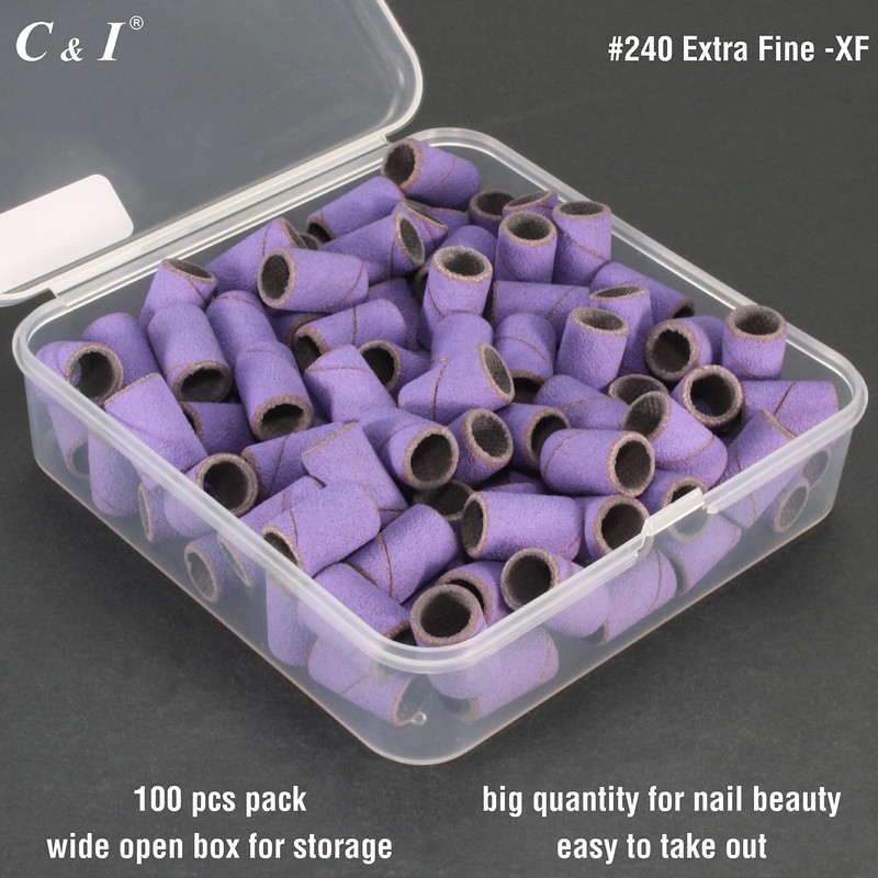 - Packing: Nail Sanding bands, 100 pcs, Grit 240 Extra Fine, Purple; and upgrade mandrel, 1 pc. Replaceable sanding bands, big quantity. Save your money. You can change it with a low cost, but with the same function of each new sand band. A perfect substitute for nail drill bits. Professional e-file for nail salon, nail studios or nail art fans use at home.