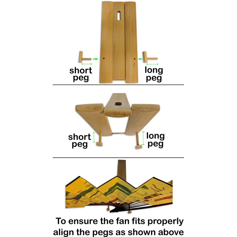 This simple bamboo fan stand is large, adjustable and (most important) beautiful to hold up your carefully curated Asian folding fan collection in style. Tried other fan stands to your disappointment? This is a quality stand to match your folding fan collection. Adjustable for flat surface display or also wall hanging! Be sure to put the longer peg into the right side (facing the display - see picture). The fans open from left to right so the bottom right needs a bit more space. Then slide the fan down onto the pegs and straighten. For best use do not use in rooms with ceiling fans/open windows to avoid errant gusts of air knocking the fan down.