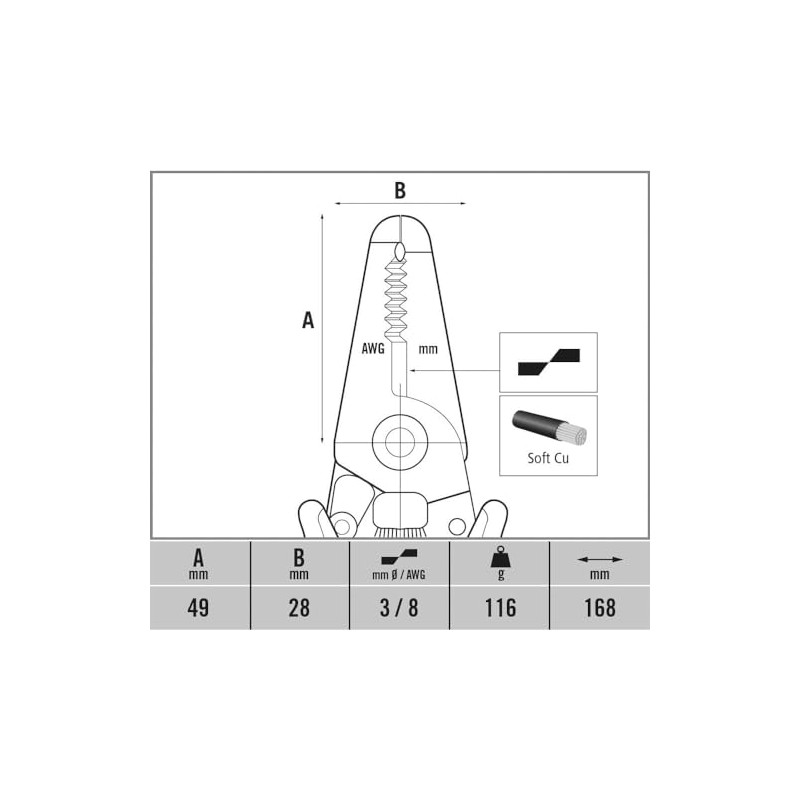 - Integrated shears for cutting soft copper wires up to 3mm O / 8AWG Stranded