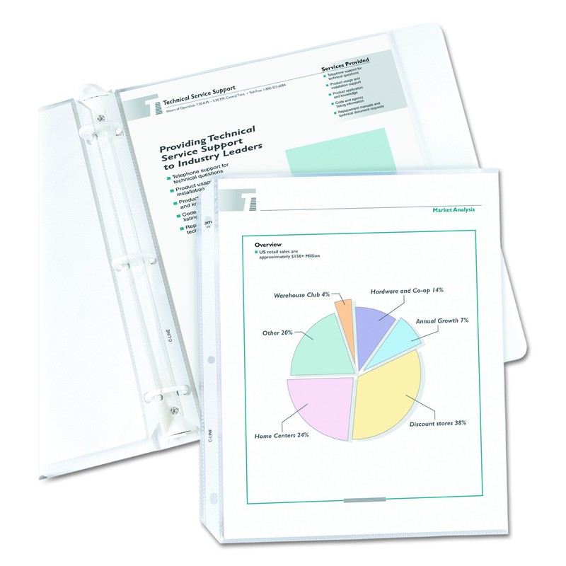 Sheet protectors offer a top-loading design, being sealed on three sides. No punching of sheets is necessary. Load the sheet while the protector remains in the binder. Sheet protectors fit standard three-ring binders. Polypropylene material offers safe, archival quality, no photocopy-transfer protection. Strong, reinforced binding edge prevents tears with heavy use.