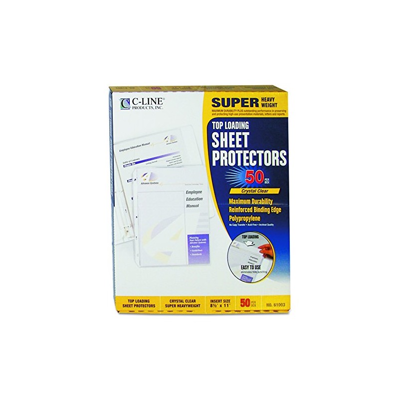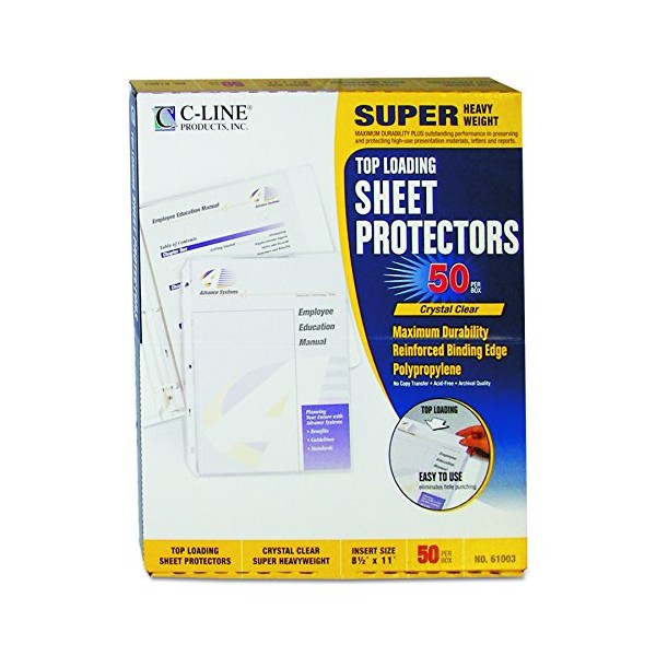 Make a lasting impression when it counts! The C-Line Super Heavyweight Top loading Sheet Protectors are made from C-Line's heaviest polypropylene material, and make great-looking presentations and reports. The durable clear finish makes them especially well-suited for high-use documents. As with C-Line's other polypropylene sheet protectors, the Super Heavyweight Sheet Protectors provide non-stick, archival-quality protection with easy top-loading document insertion, eliminating the need for sheet punching. Each box contains (50) 8 1/2\ X 11\" super heavyweight sheet protectors."