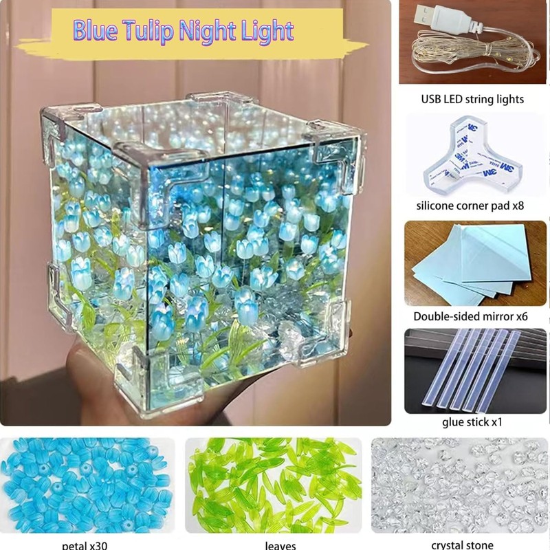 C&M LED Tulip Night Light, Decorative Table Lamp with Mirror, 21 Flowers, Handmade DIY Magic Cube Design (Blue)