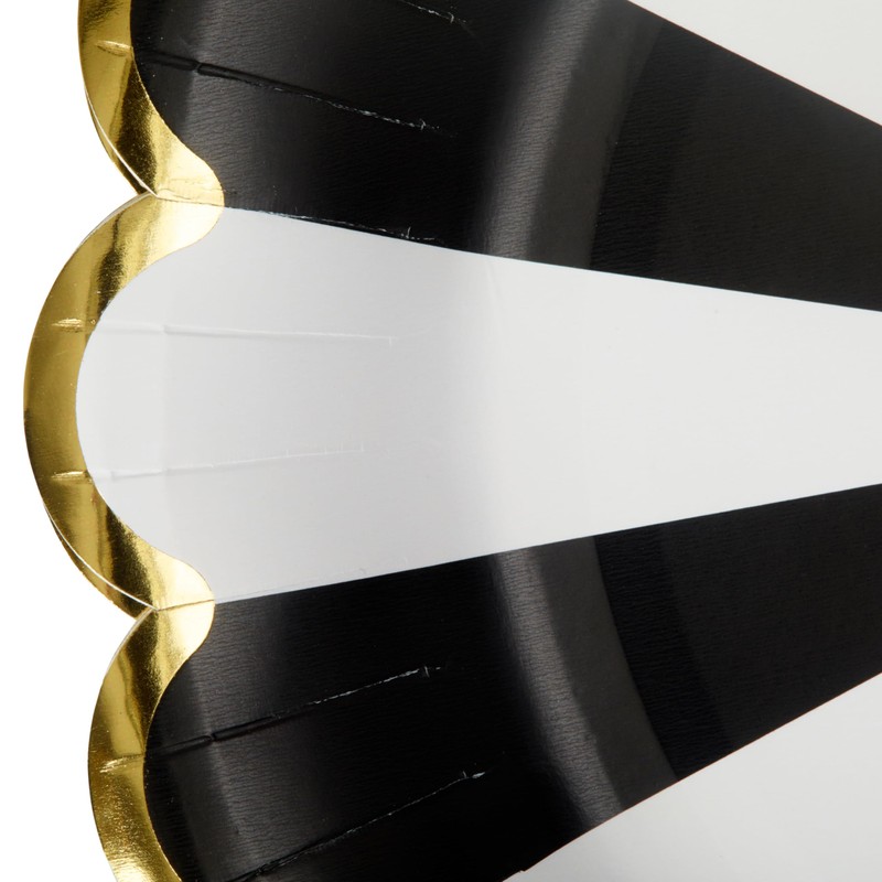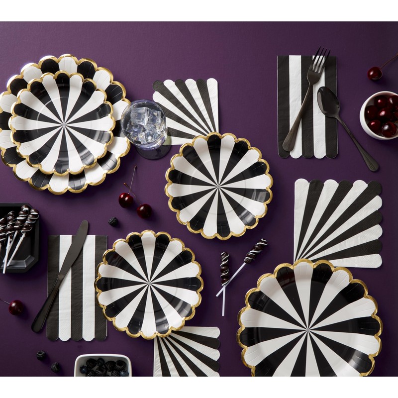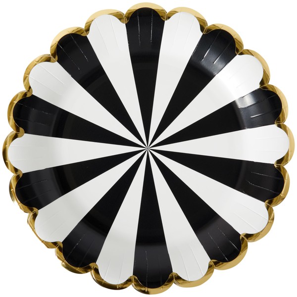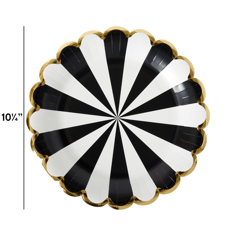 - Featuring an eye-catching black and white pinwheel design with a touch of gold foil embellishment on the dinner and lunch plates, this paper plate pack brings an element of glamour to any gathering