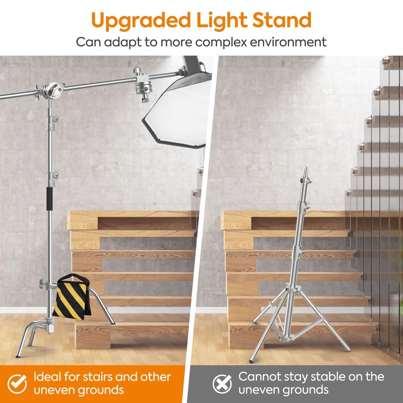 • Upgraded Light Stand: Can adapt to more complex environment,such as stairs and other uneven grounds. Sliding legs can be folded flat for space-saving storage. Non-slip rubber pad on the bottom, prevents scratches on floors.