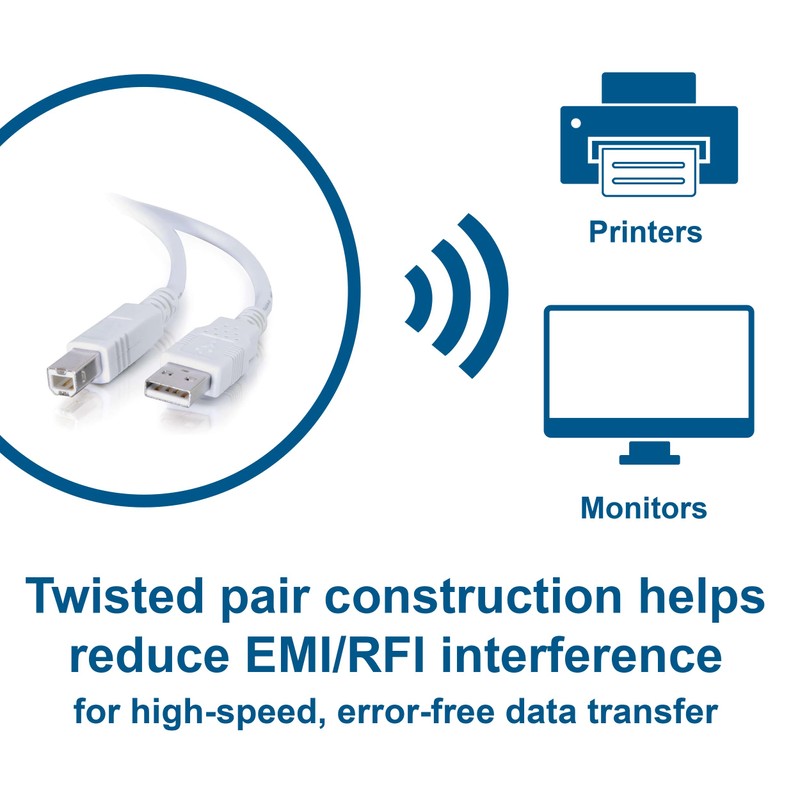 Just plug-and-play for keyboards, mice, modems, printers, and other USB peripherals. This cable provides a transfer rate up to 480 Mbps depending upon the peripheral's USB version, and easily attaches to any USB device. Foil and braid shielding reduces EMI/RFI interference and twisted pair construction helps reduce crosstalk thus ensuring high speed, error-free data transfer.
