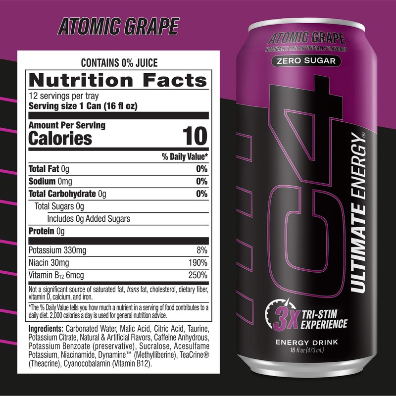 Cellucor C4 Ultimate | Pre Workout Sugar Free Energy Drink | Tri-Stim Experience with 300mg Caffeine + TeaCrine + Dynamine | Atomic Grape | 16oz (Pack of 12)