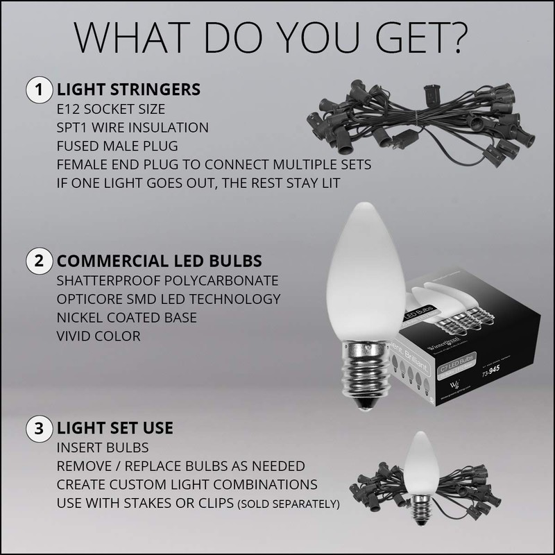 - [ C7 WARM WHITE SMOOTH/OPAQUE NON-TWINKLE LED LIGHTS ] 25 OptiCore warm white smooth/opaque C7 steady LED bulbs and 25-foot white stringer with 25 sockets spaced 12 inches apart. 6-inch lead with fused polarized male plug and 6-inch tail with female plug for easy end to end connections. 25 feet total length. To assemble, simply twist bulbs into sockets.