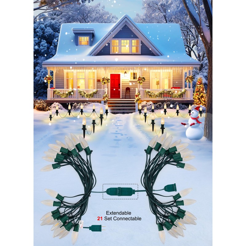 - Connectable Christmas Walkway Lights: These connectable christmas decorations outdoor yard llights are easily installed with the equiped stakes, you can fix or place them anywhere necessary.They are connectable to 21 sets of C9 LED lights, 540 feet will be available to maximize your expectation for larger area lighting and festival decorations. With the anchor spike plugging in the snowfield, the Christmas pathway lights are definitely the blooming flowers in the winter garden