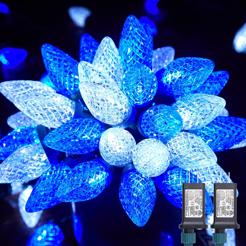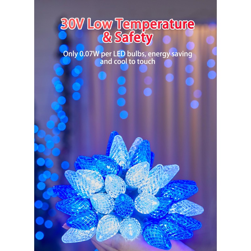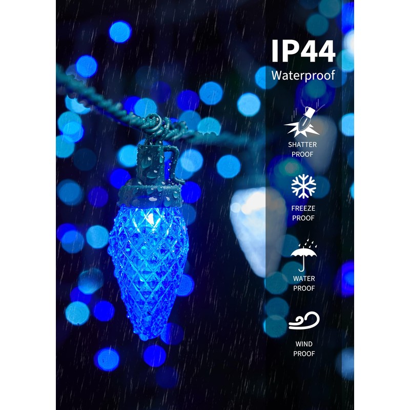 • Waterproof Shatterproof Blue and Pure White Christmas Lights: Designed with impact-resistant, shatterproof C9 LED bulbs that withstand drops; Christmas outdoor lights are IP44 waterproof, and can withstand extreme temperatures, rain, wind, and damp climates, ensuring durability and safety, suitable for both indoor and outdoor use