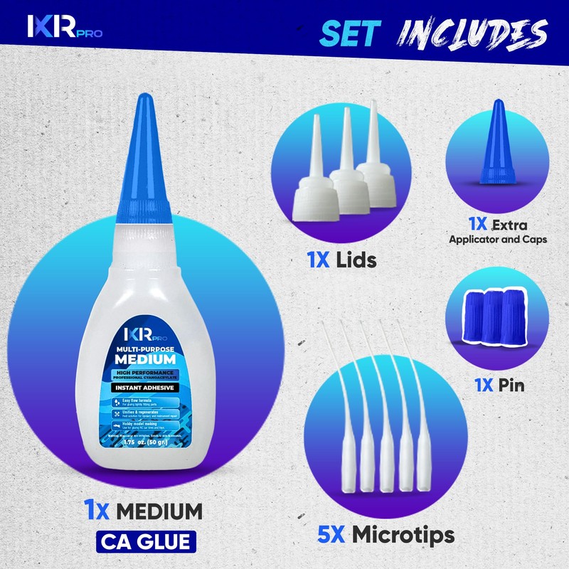 • PACKAGE CONTENTS: 1.75 oz. Cyanoacrylate Glue (Medium), 5 Microtips, 1 Pin, 1 Lid and 1 Extra Cap.