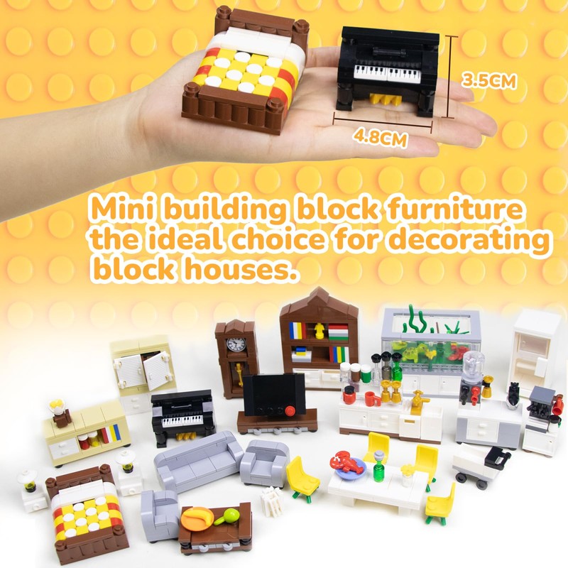 - Bausteinfurnitur umfasst: Bücherregale, Pianos, Aquarien zum Betrachten, Sofas, Couchtische, Fernsehgeräte und mehr, Die perfekt für die Ausstattung Deiner Stadt oder Szenen sind.