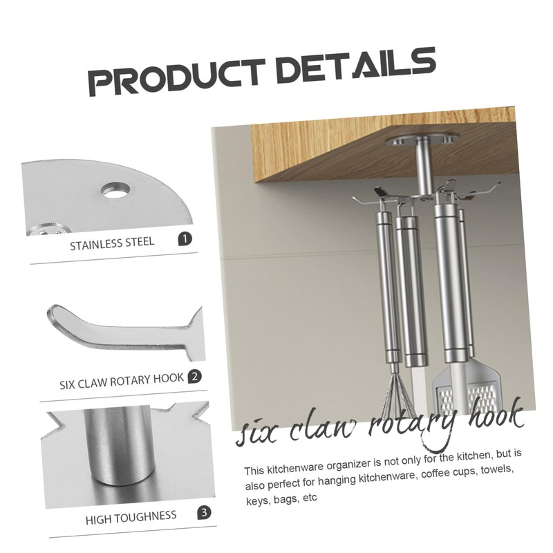 Cabilock 2pcs Six Claw Swivel Hook Under Cabinet Hook Kitchen Utensil Hanging Hooks Cookware Kitchen Rotating Hangers Flatware Utensil Storage Heavy Duty Hooks Rack Stainless Steel Silver