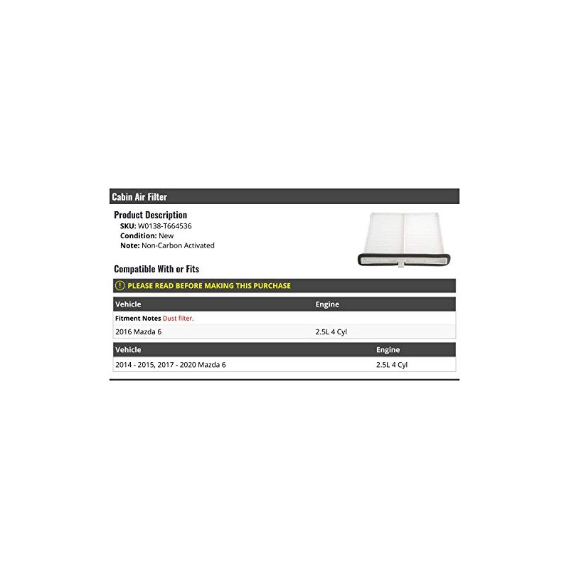 - Compatible with or fits: (Note: Dust filter.; 2016 Mazda 6 2.5L 4 Cyl) (2014 - 2015, 2017 - 2020 Mazda 6 2.5L 4 Cyl)