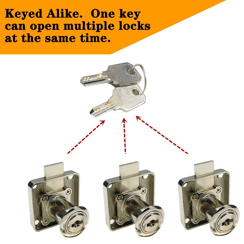 - 4: Easy Installation, Complete Accessories, Screws, Baffles, Bolts Complete. Meet Your Different Cabinet Uses. Special Note: The Key to Each Lock is The same. Each Lock Comes With Two Interchangeable Keys. One Key Can Open Multiple Locks at the Same Time. Solved, Because You Have Too Many Keys, And Brought The Trouble.