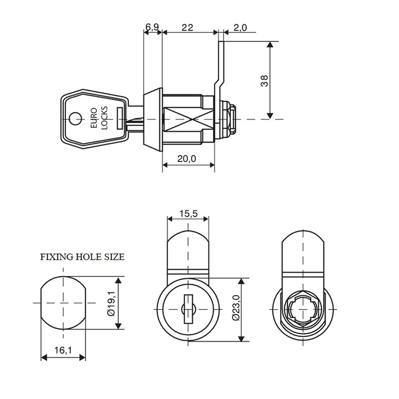 - 1 piece cabinet lock, furniture lock, letterbox lock, lever lock, 20 mm with 2 keys, Euro locks, ISO 9001