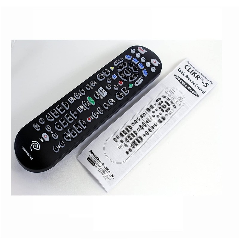 SPECTRUM CLIKR-5 Cable Remote Control Universal Programmable Remote Control for Spectrum, Brighthouse, and Time Warner Cable Set-top Cable Boxes. The Spectrum CLIKR-5 is designed to offer complete control for all digital, HD and DVR set-top boxes. The UR5U-8780L is factory programmed to operate all Spectrum set-top boxes as well as Scientific Atlanta/Cisco and Samsung set-top boxes. In addition to the set-top box the CLIKR-5 can also control TV’s, VCR’s, DVD players and Auxiliary equipment such as audio receivers and home theater systems. The Spectrum CLIKR-5 features a fully backlit keypad and upgradeability. Features and Benefits * Tru2way / OCAP compliant * Control up to 5 devices * 64-K chip pre-loaded with the largest code library in the industry * Dedicated ON DEMAND button * System Power button for powering on/off all devices with one button * Illuminated mode buttons (AUX, DVD, VCR, TV, CBL) * Full keypad backlighting featuring exclusive ‘night vision’ red illumination * ‘Sure Touch’ cursor navigation pad * The industry’s simplest & quickest device code programming * Quick programming instructions included * Memory Lock retains programmed memory for 10 years even with Batteries removed Specifications Size: 2.875?(W) x 8.5?(L) x 1.125?(D) Weight: 4.1 oz Power Supply: 2 x AA Batteries Included. User Manual Operating Instructions For CLIKR-5 Cable Remote Control