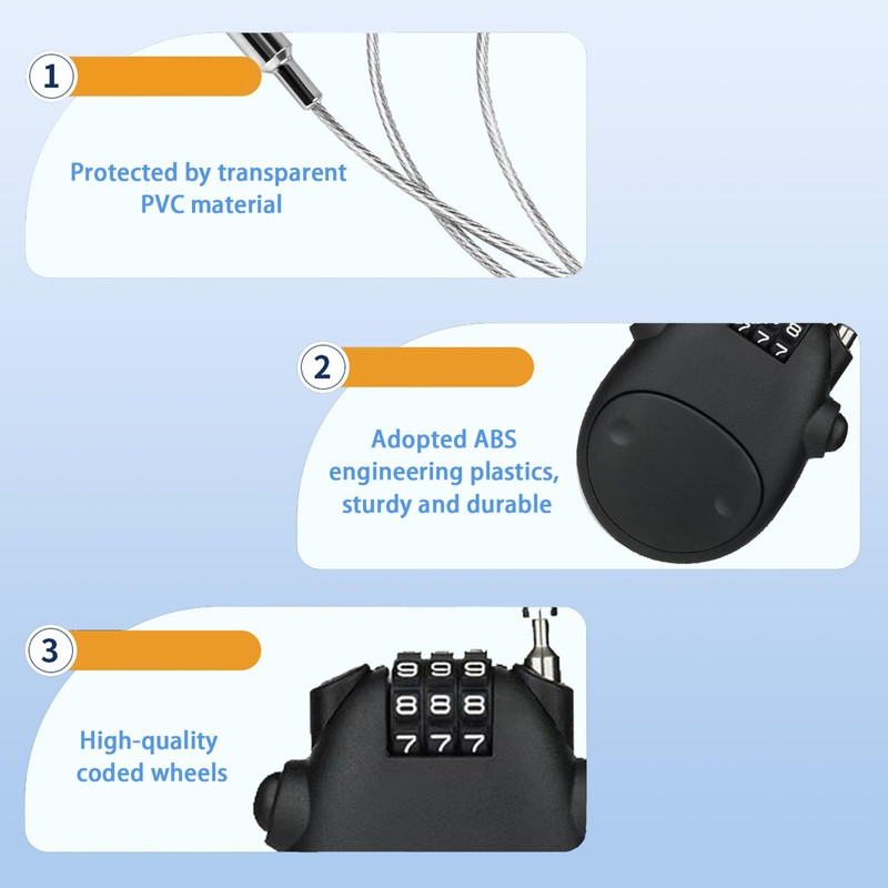 - 【High-quality Materials】Our cable lock is made of PVC material, adopted ABS engineering plastic for strength and durability,and there are high quality combination wheels.