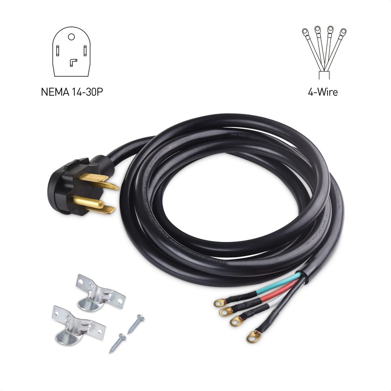 - Rugged & safe with a right-angle dryer plug that connects securely into the outlet; 30A 14-30 plug has side grips to assist in unplugging when necessary; Color-coded cords are designed with molded ring terminals for easy installation; Strain relief bracket supports the weight of the cord at the dryer end