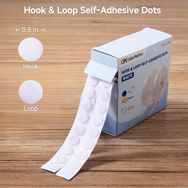 Cable Matters 400 Pcs (200 Pairs) Hook and Loop Self-Adhesive Dots, 0.5 Inch Diameter, Round Adhesive Dots for Crafts, Classroom, Office, Home Organization, White