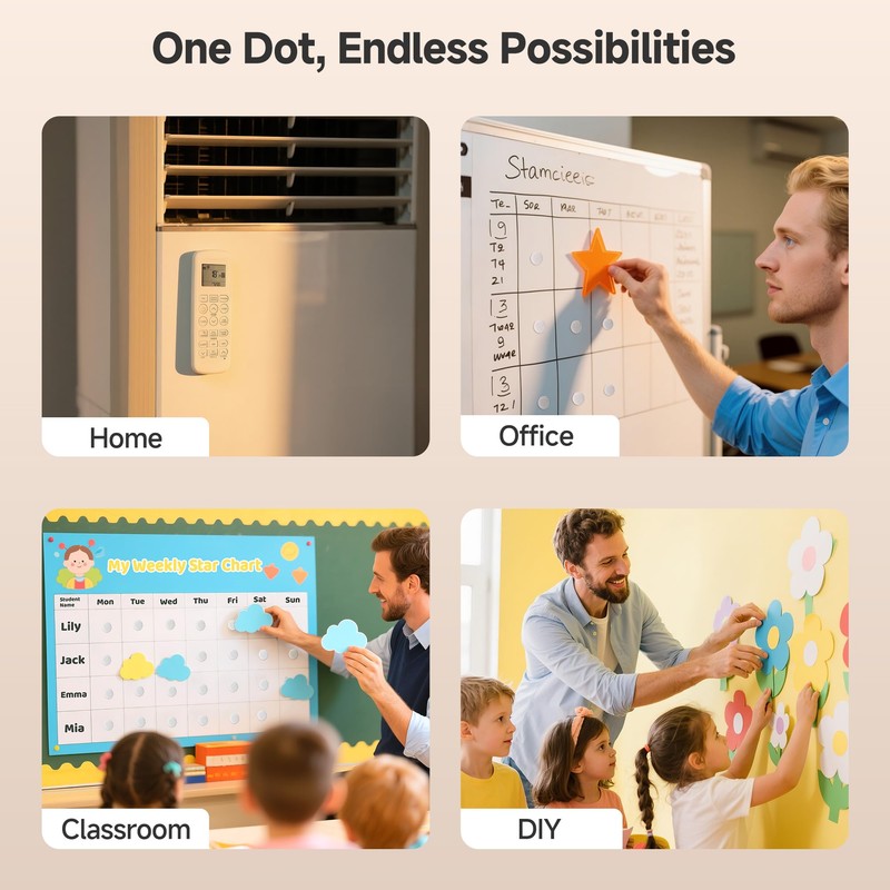 - Works on Smooth Surfaces: Stick securely to plastic, glass, metal, wood, tile, cardboard, and other clean, flat surfaces. These round adhesive dots deliver a strong grip across various materials, making them an ideal no-drill hanging solution for lightweight items.