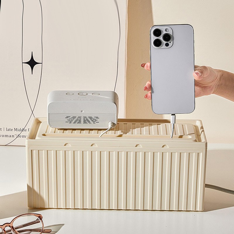 - Keep Desktop Tidy: Minimize cord clutter with our Cord Storage Box. double-side outlet holes prevent wire entanglement and enable easy insertion and hiding of power cords, keeping your desk tidy and organized