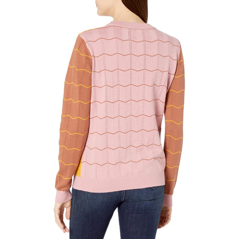 - [Design Features] - This long sleeve sweater showcases a playful zig-zag wavy stripe and colorblock pattern, enhanced with elegant pointelle details. The ribbed crew neckline, cuffs, and hem add a polished touch, blending comfort with effortless flair.