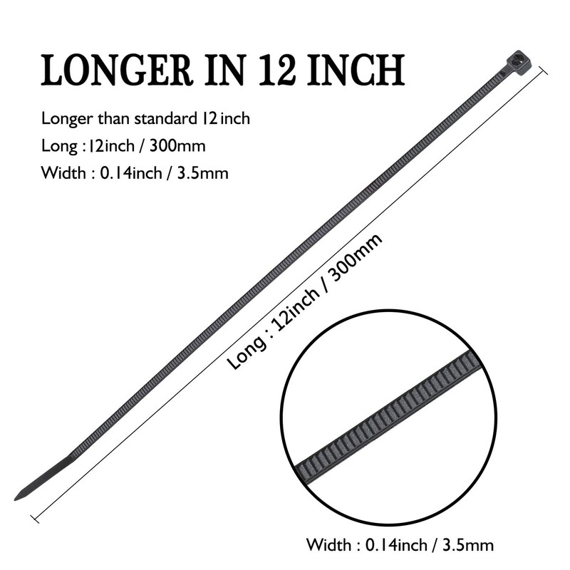 - ✅【Size and Quantity】 Nylon Cable Ties, black, 12 inches long, 0.15 inches wide, 100 pieces per pack, Tensile Strength: 18kg